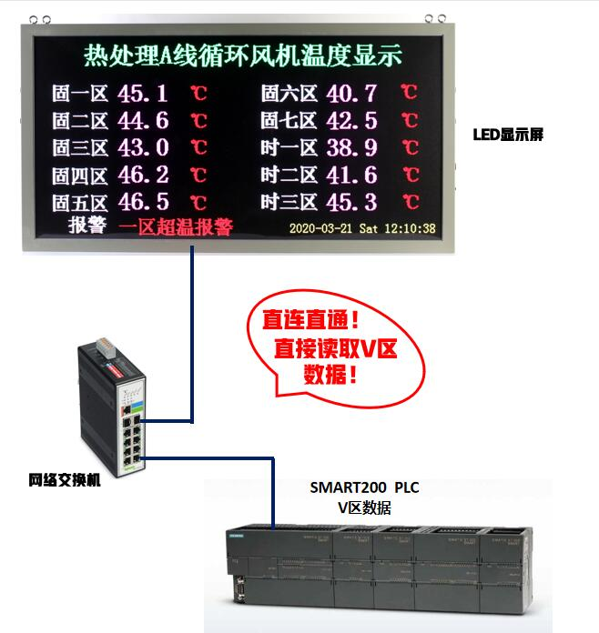 S7-SMART200 PLC与LED工业大屏正常连网运行,S7-SMART200 PLC(举例:S7-SMART200 SR20) 的V区实时数据将动态刷新到LED工业大屏上显示。