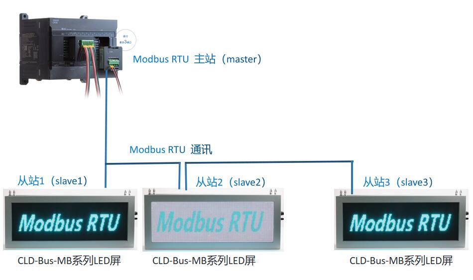 一个CPU模块下面可以连接多块LED工业屏,每个LED工业屏可以设置不同的Modbus-RTU的从站(slaver)地址,使用金属屏蔽双绞线通讯电缆,最远通讯距离可以长达1000米,LED工业屏配置的RS-485接口为光电隔离端口,推荐的通讯波特率为9600 bps,或者19200 bps。