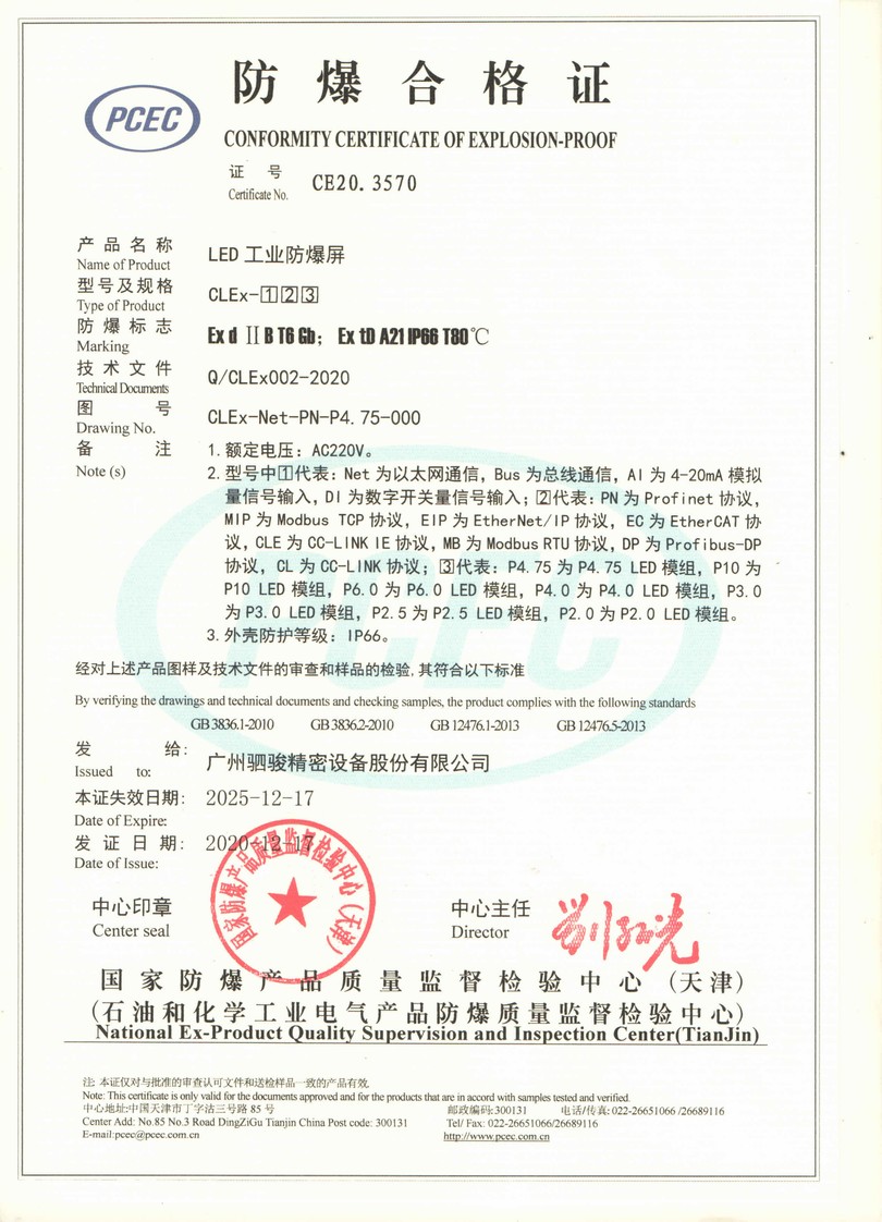 CLEx系列LED工业防爆屏,驷骏通显品牌的一款专业用于2区(IIB)爆炸性气体环境下危险场所的隔爆型(Ex d)LED工业防爆屏即LED工业隔爆屏,此系列中Modbus RTU协议接口的LED工业防爆屏,显示屏的防爆壳体通过国家防爆认证,具有合格资质的国家认证机构出具的防爆合格证书,可以与各种类型支持Modbus RTU协议的现场仪器仪表、以及自动化控制系统真正实现直连直通,完全免SDK二次开发编程,无需任何第三方软硬件环节的转换或发送。